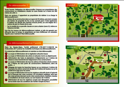- Le débroussaillement est une obligation de l’article L 321-5-3 du code forestier qui le définit comme étant l’ensemble des opérations dont l’objectif est de diminuer l’intensité et de limiter la propagation des incendies.