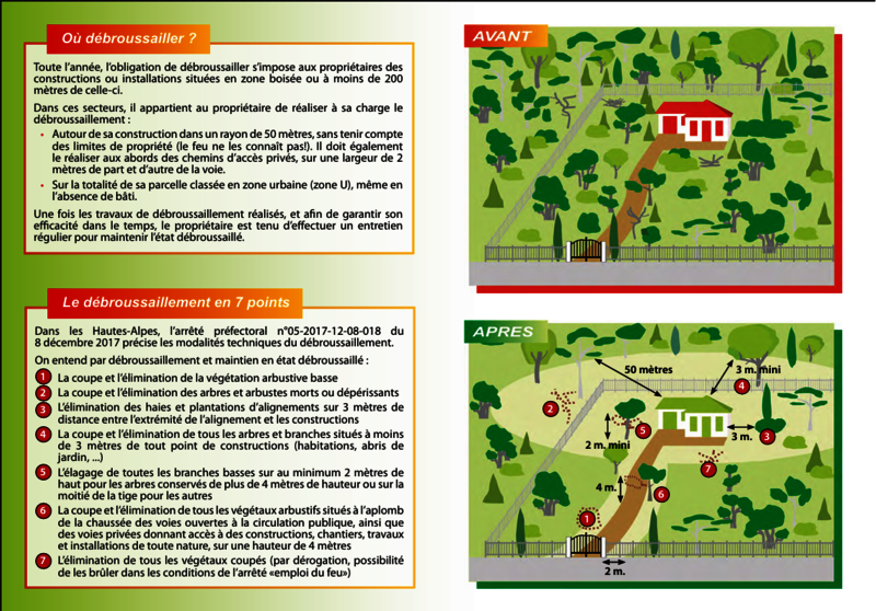 - Des prescriptions techniques et réglementaires figurent également dans l' Arrêté préfectoral n° 05-2025-11-03-00002 du 3 novembre 2025 : il réglemente le débroussaillement dans les Hautes-Alpes.